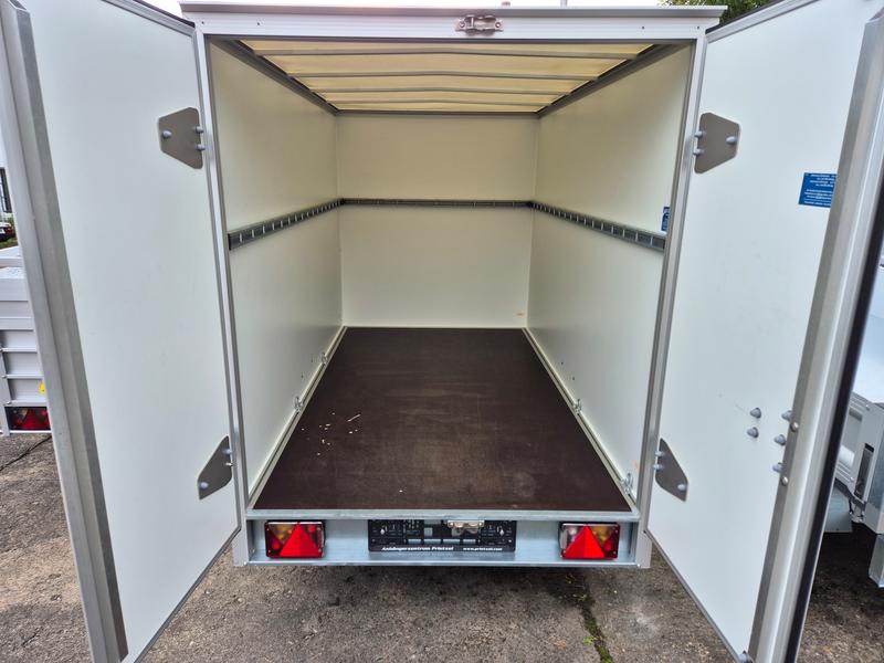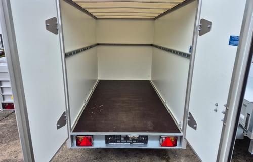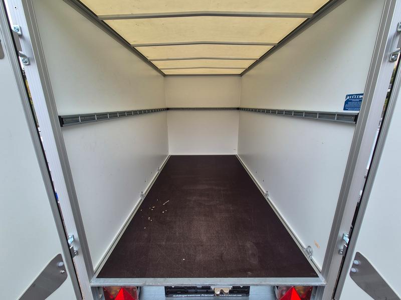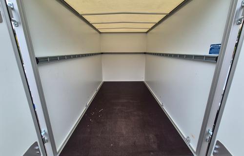 Wände aus selbst produzierten, gewichtsoptimierten Unique Panels für deutliche Nutzlaststeigerung, bestehend aus GFK-Stahl-Sandwich in Verkehrsweiß (RAL 9016)
